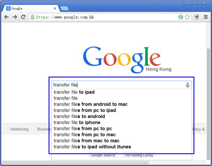 打開(kāi)Google,并在搜索框中輸入你(nǐ)想查尋的(de)關鍵字,我們這(zhè)裡(lǐ)輸入:“transfer file”,當輸入後,你(nǐ)立即就(jiù)會(huì)看(kà n)到(dào)搜索10條相(xiàng)關關鍵字建議(yì),如(rú)下(xià)圖所示。