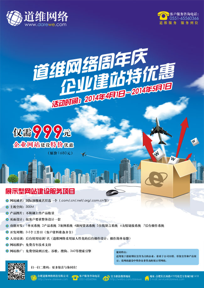 最優惠套餐為(wèi)“展示型網站(zhàn)建設服務項目”原價為(wèi)1680的(de)展示型企業$(yè)網站(zhàn)建設,活動期間(jiān)僅需999元,掃描道(dào)維官方微(wēi)信二維碼更有(yǒu)驚喜。